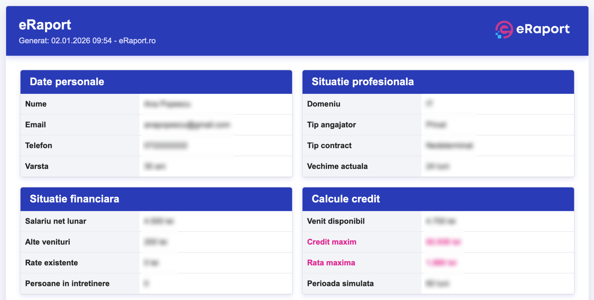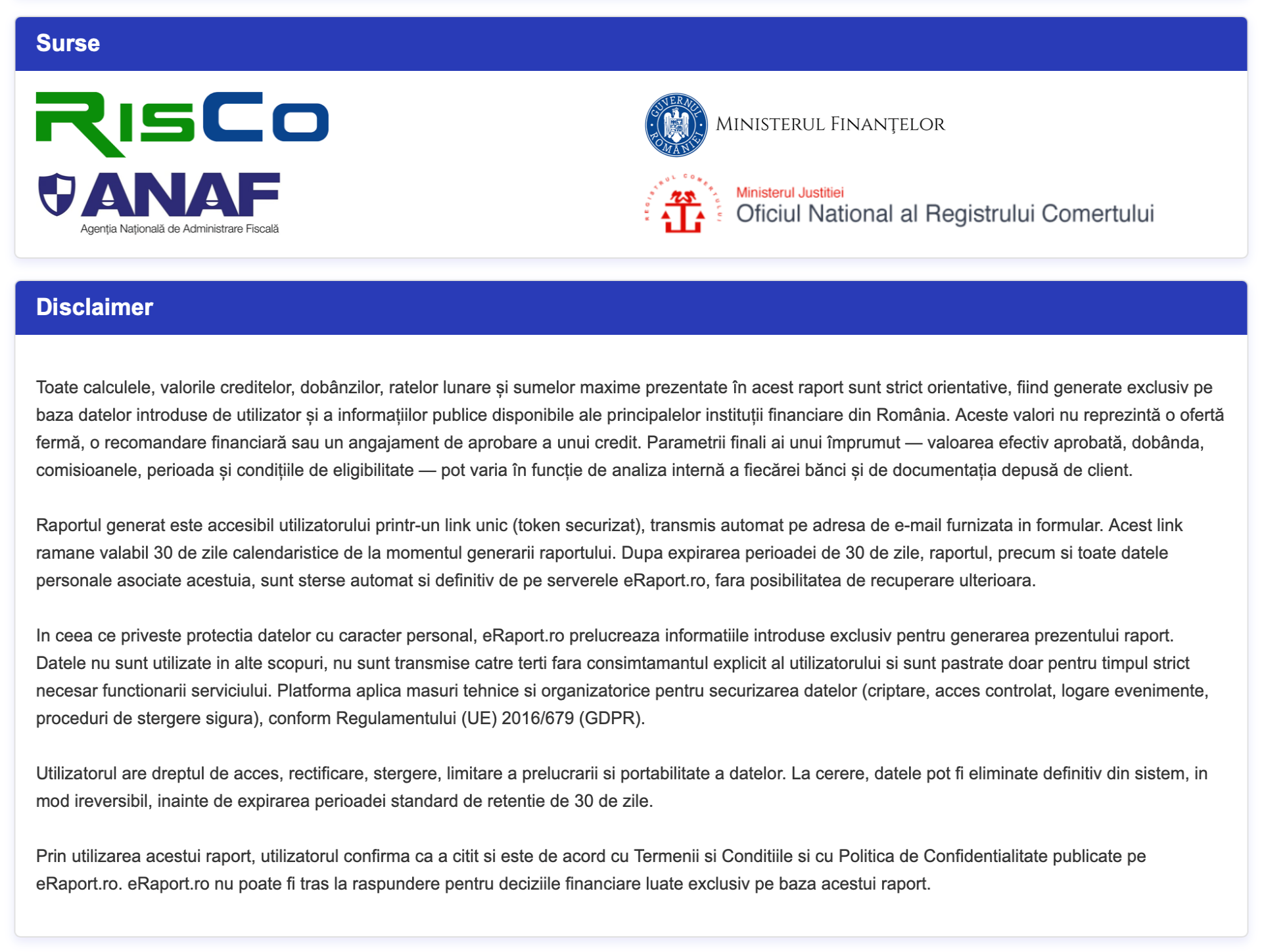 Raportul este pus la dispoziția utilizatorului printr-un link securizat, transmis automat pe e-mail, valabil pentru o perioadă limitată de timp. Datele personale sunt prelucrate exclusiv în scopul generării raportului, nu sunt transmise către terți și sunt protejate prin măsuri tehnice și organizatorice conforme cu Regulamentul (UE) 2016/679 (GDPR). Utilizatorul este informat că deciziile financiare luate pe baza raportului îi aparțin în totalitate, iar eRaport oferă un instrument de analiză și informare, nu un angajament de finanțare.