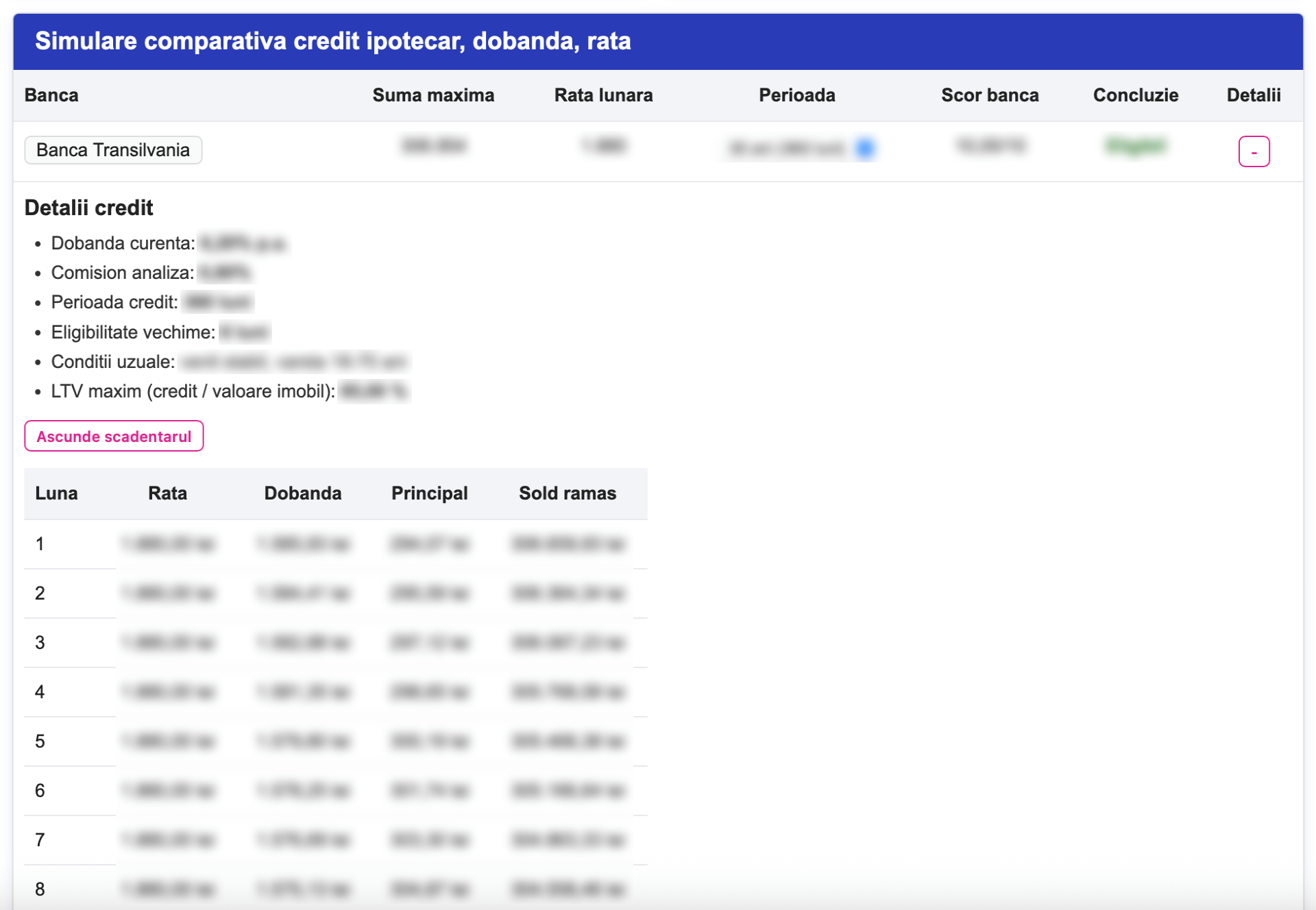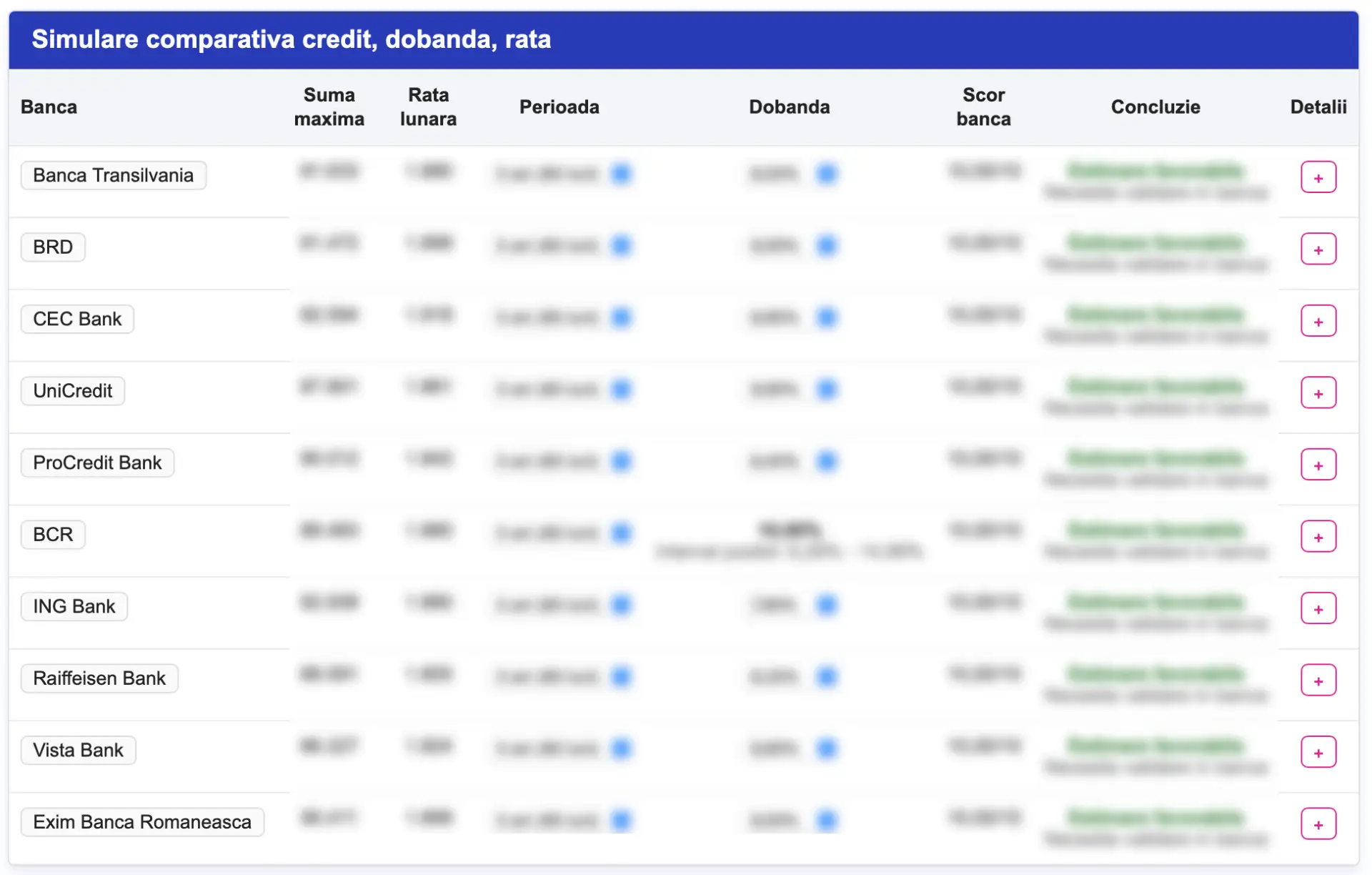 Concluzia afișată pentru fiecare bancă te ajută să înțelegi rapid dacă oferta este potrivită pentru profilul tău, iar coloana „Detalii” îți permite să accesezi informații suplimentare despre calculul respectiv.