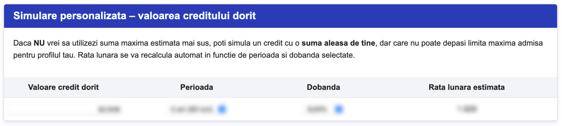Această secțiune îți permite să simulezi un credit pornind de la o sumă aleasă de tine, chiar dacă este mai mică decât suma maximă estimată anterior. Platforma verifică automat ca valoarea introdusă să nu depășească limita maximă admisă pentru profilul tău financiar.