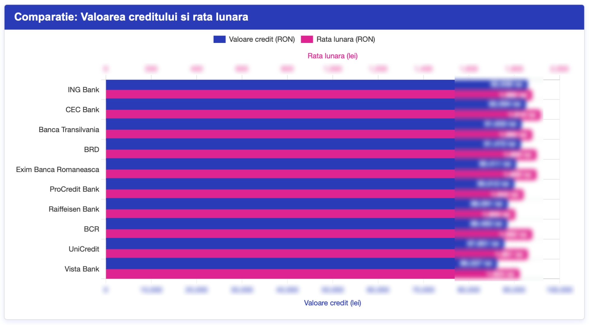 Această secțiune oferă o vizualizare comparativă clară între bănci, evidențiind simultan valoarea creditului estimat și rata lunară aferentă pentru fiecare instituție financiară analizată.