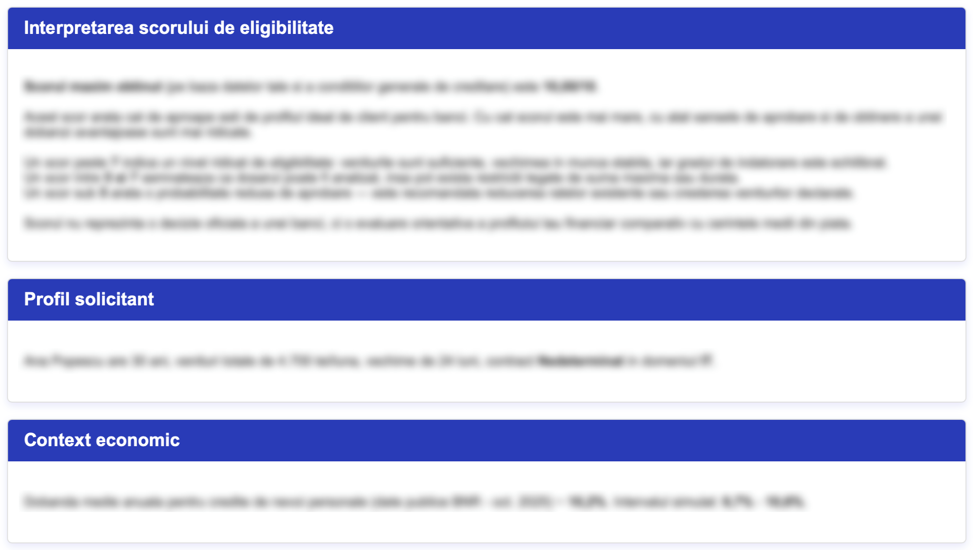 Această secțiune oferă o interpretare completă a situației tale financiare, așa cum este evaluată de bănci, combinând scorul de eligibilitate, profilul solicitantului și contextul economic actual.