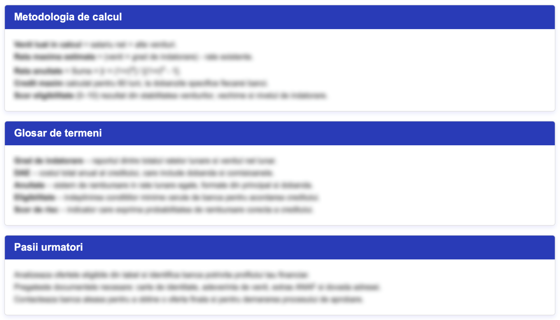 Pe baza acestor informații, platforma calculează automat venitul disponibil pentru creditare, precum și suma maximă estimată pe care o poți împrumuta și rata lunară maximă pe care o poți susține, în funcție de regulile bancare standard și gradul de îndatorare aplicabil.