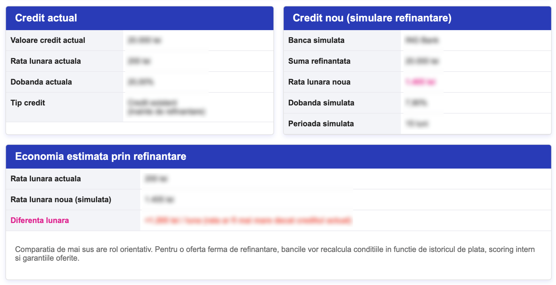 Pe baza sumei refinanțate, dobânzii simulate și perioadei alese, platforma calculează automat noua rată lunară estimată și evidențiază diferența lunară față de rata actuală. Astfel, poți vedea rapid dacă refinanțarea îți aduce o economie lunară și în ce măsură noul credit este mai avantajos pentru situația ta financiară.